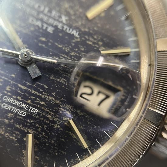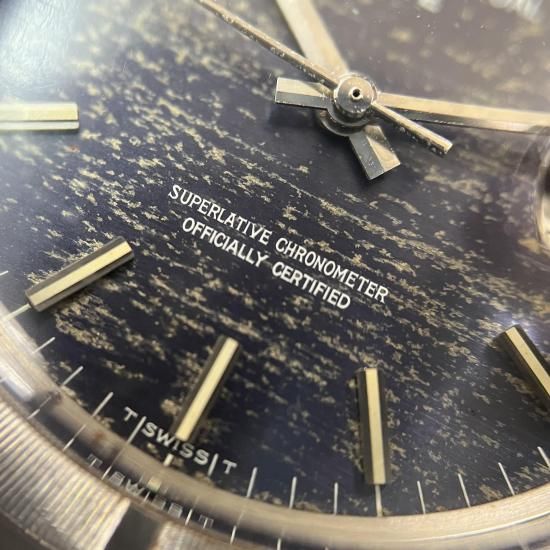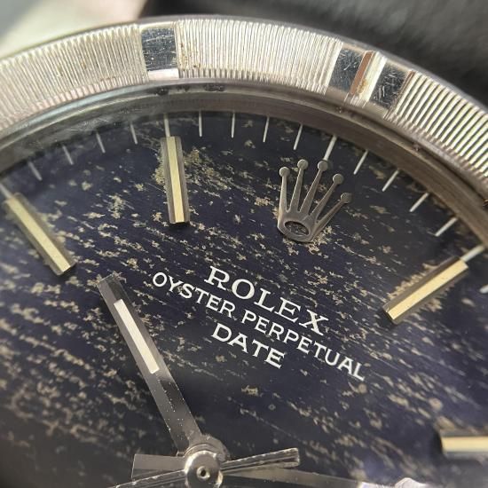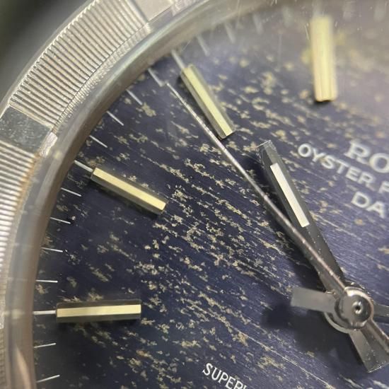 ブルーの文字盤は全体が程よくヤケて、アンティーク独特の経年変化によりモザイクパターンのように。アンティークならではの雰囲気の良い“オイスターパーペチュアル・デイト”です。